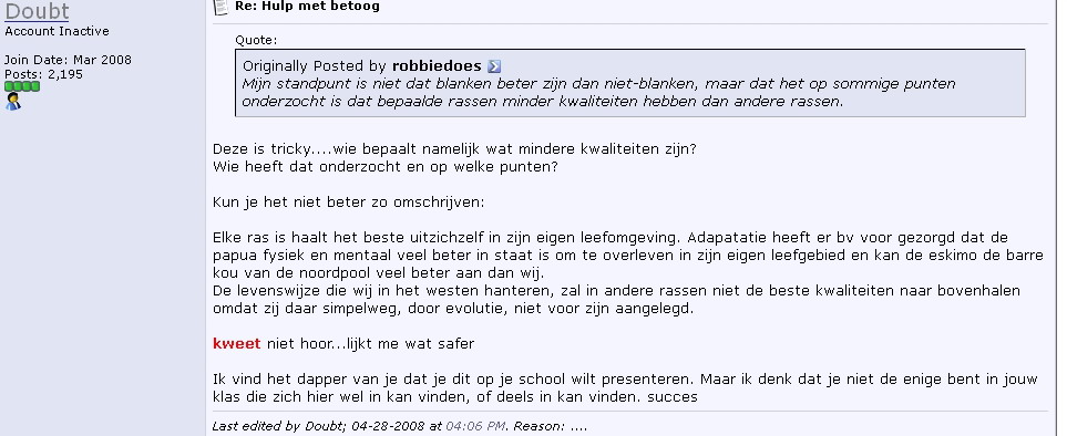 Maar het draait bij Nunes niet alleen om Moslims, in verdere berichten op Stormfront blijkt het haar ook om ‘rassen’ te gaan: ‘Elke ras is haalt het beste uit zichzelf in zijn eigen leefomgeving. (…) De levenswijze die wij in het westen hanteren, zal in andere rassen niet de beste kwaliteiten naar bovenhalen omdat zij daar simpelweg, door evolutie, niet voor zijn aangelegd.’